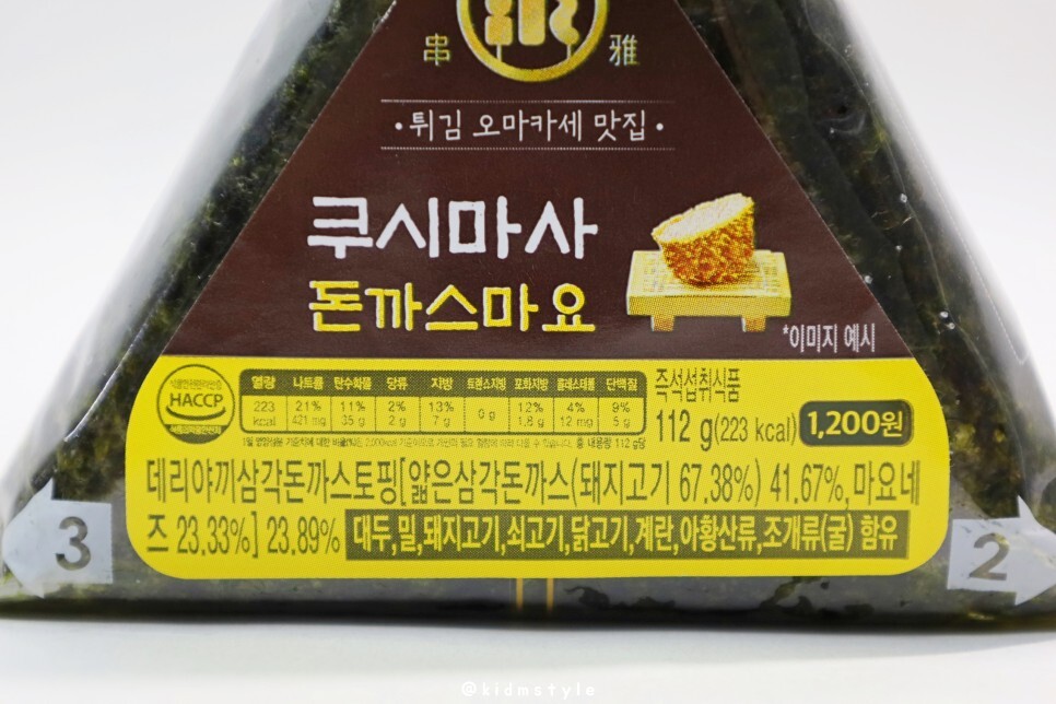 당연히 HACCP 해썹 시설에서 만들었고 가격은 1,200원이다. 112g에 223kcal로 단독 식사로 먹기에는 양이 부족하다. 컵라면과 곁들이면 딱일 듯.