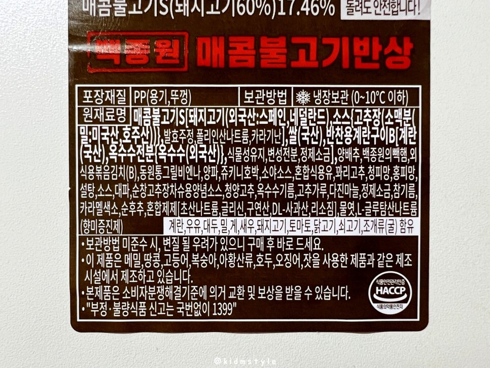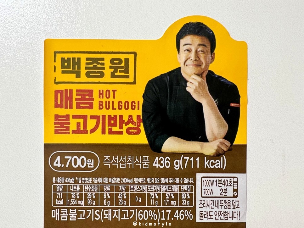 CU 백종원 매콤 불고기반상 영양성분 정보를 살펴봅시다. 436g, 711kcal입니다. 양호한 수준이죠. 불고기의 주 재료는 돼지고기 60%입니다. 편의점 전자레인지로 1분 40초, 가정용 700w로는 2분 돌리면 됩니다. 뚜껑 덮고 돌려도 무슨 일 안 일어나니까 그냥 덮고 돌려주세요.