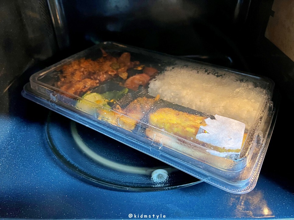 전자레인지에 넣고 돌립니다. 꺼낼 때 조심하셔야 합니다. 돌리고 나면 뜨거워진 밥, 반찬들 때문에 도시락이 조금 쳐지는 느낌이 드는데요. 뜨거워서 자칫 잘못하면 놓칠 수 있습니다. 저는 2번 정도 바닥에 쏟아봤습니다.