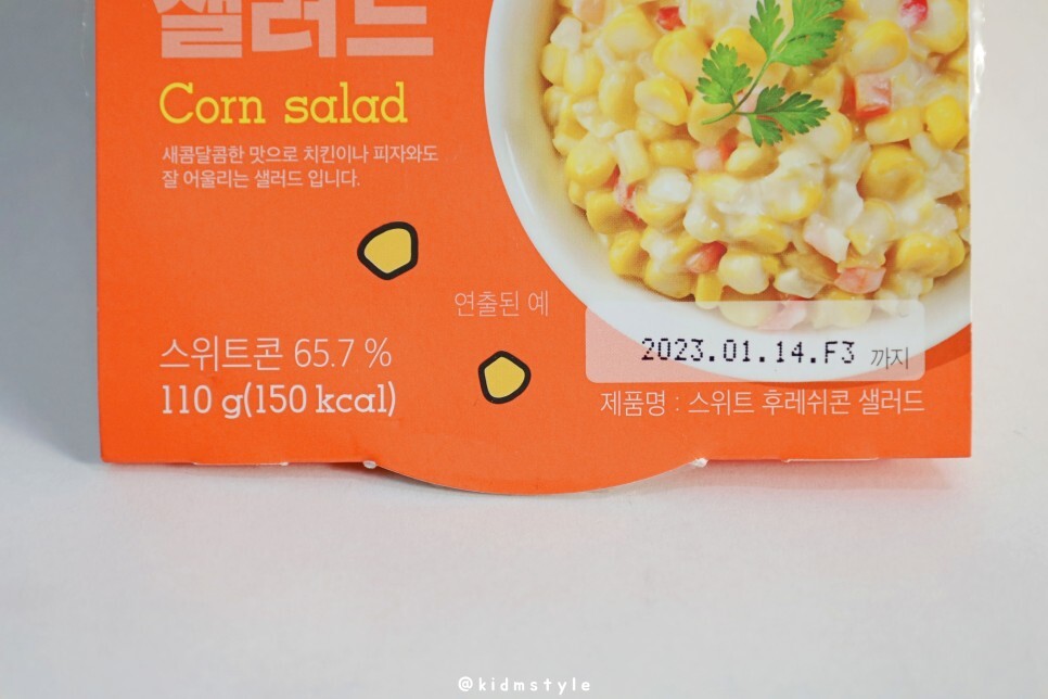 스위트콘 65%의 구성이며 110g에 150kcal입니다. 새콤달콤한 맛으로 치킨이나 피자와도 잘 어울리는 샐러드라고 소개하네요.