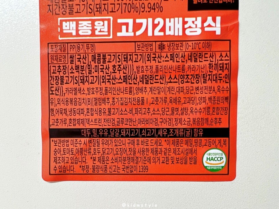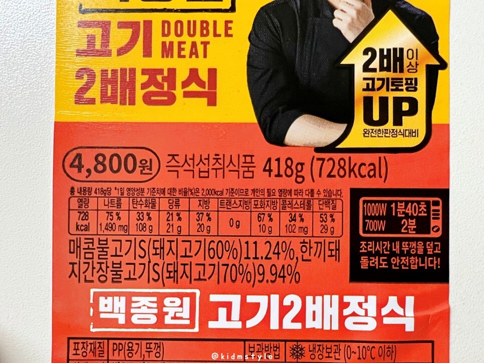 CU 백종원 고기 2배정식 영양성분 정보를 참고하시고요. 고기는 전부 돼지고기로 구성한 제품이네요. 전자레인지에 1000w 기준 1분 40초, 700w 2분 돌리면 됩니다. 물론 뚜껑은 덮고 돌려도 되고요.