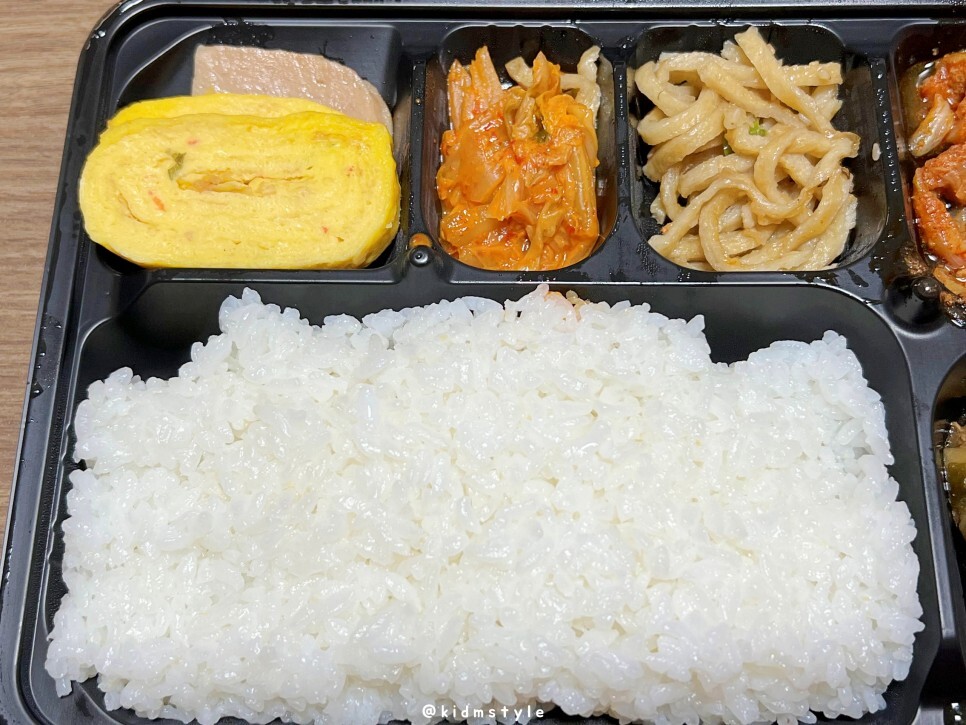 계란말이는 폭신함은 부족하며 바삭 구웠네요. 오버 쿡이에요. 간은 짜지 않고 적당합니다.
