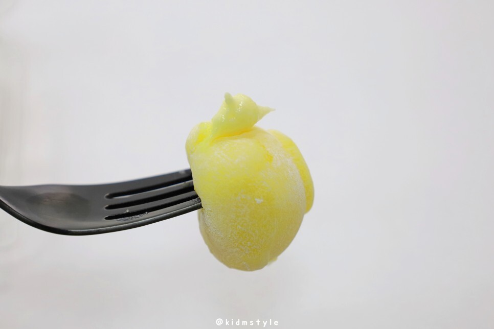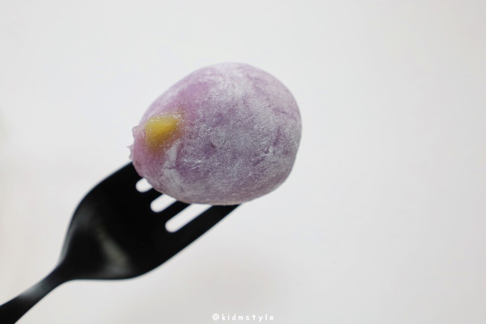 포크로 찍어보니 속 앙금이 삐져나오네요. 맛을 보니 고구마 향과 맛은 느껴지는데 앞서 맛본 딸기맛만큼 맛과 향이 느껴지지는 않네요.