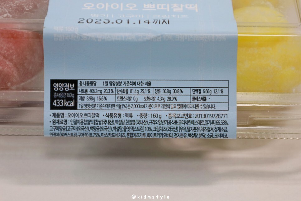 O.I.O 오아이오 쁘띠찰떡 영양성분 정보를 참고하세요. 160g에 433kcal네요. 식품유형은 떡류입니다. 어릴 때 즐겨먹던 찰떡 아이스라는 아이스크림이 떠오릅니다.