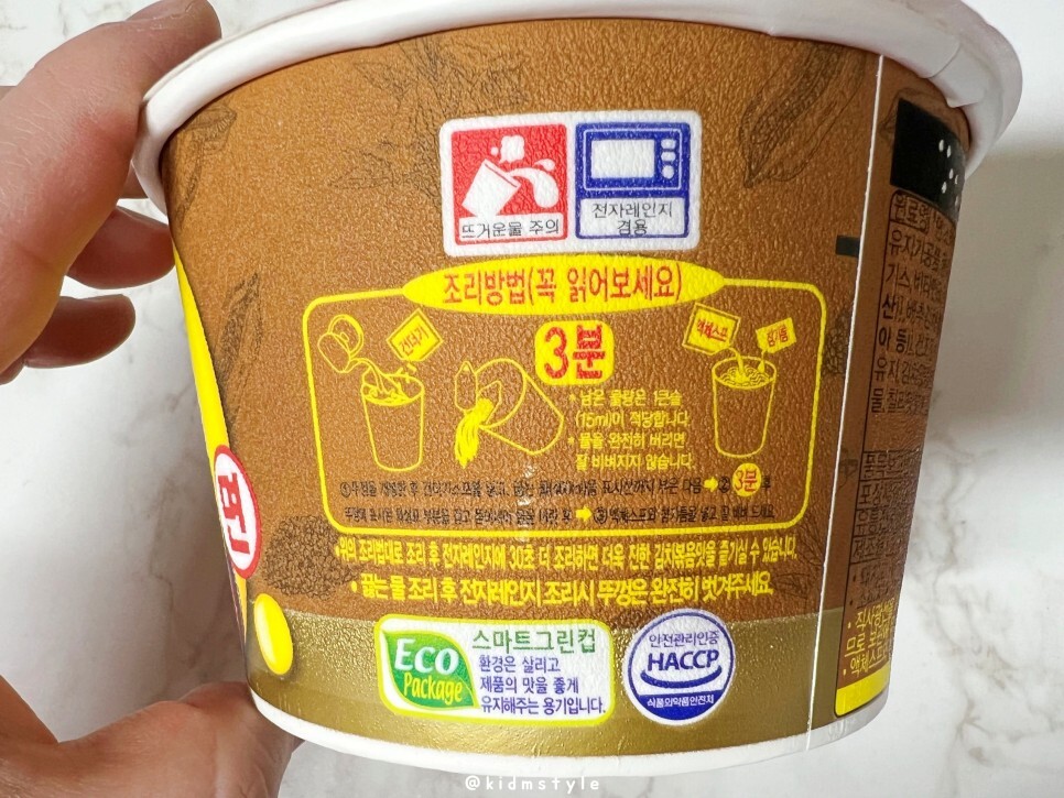 조리법입니다. 물을 완전히 버리지 말고 1큰술 15ml 정도 남겨두고 비비는 것을 추천하네요. 스마트 그린컵이라는 환경은 살리고 제품의 맛을 좋게 유지해 주는 용기를 사용하였네요.