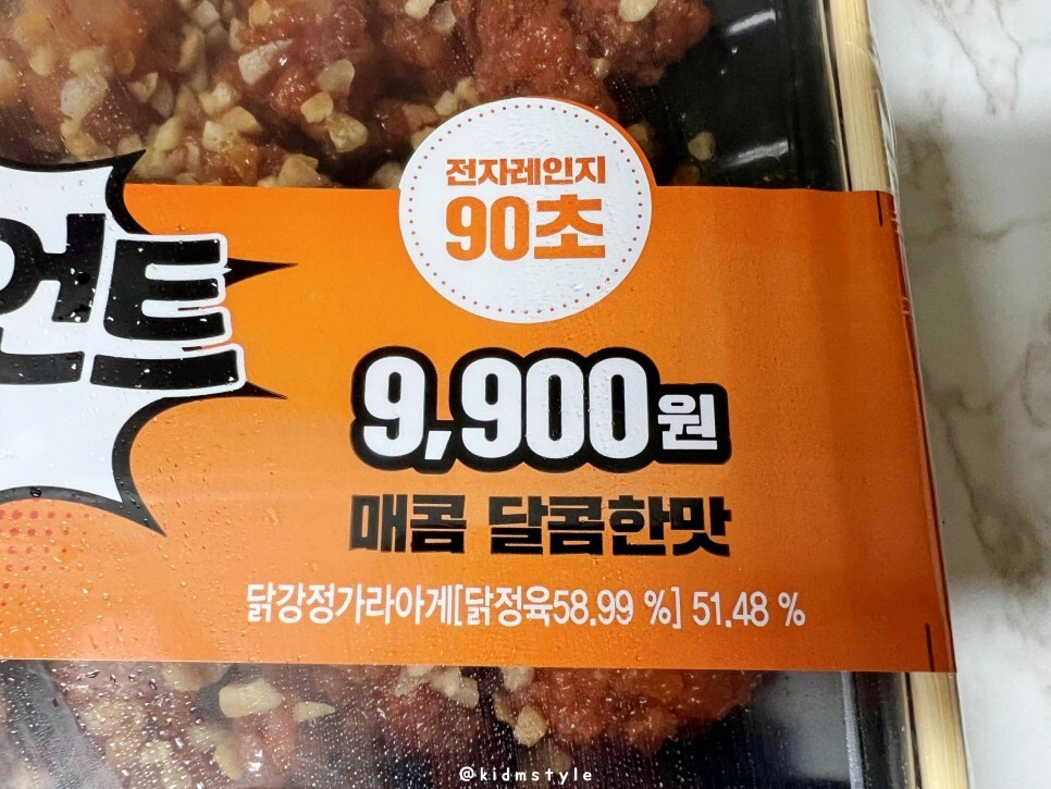 매콤 달콤한 맛이에요. 9,900원이라는 가격은 꽤 합리적으로 다가옵니다. 주 재료는 닭입니다.