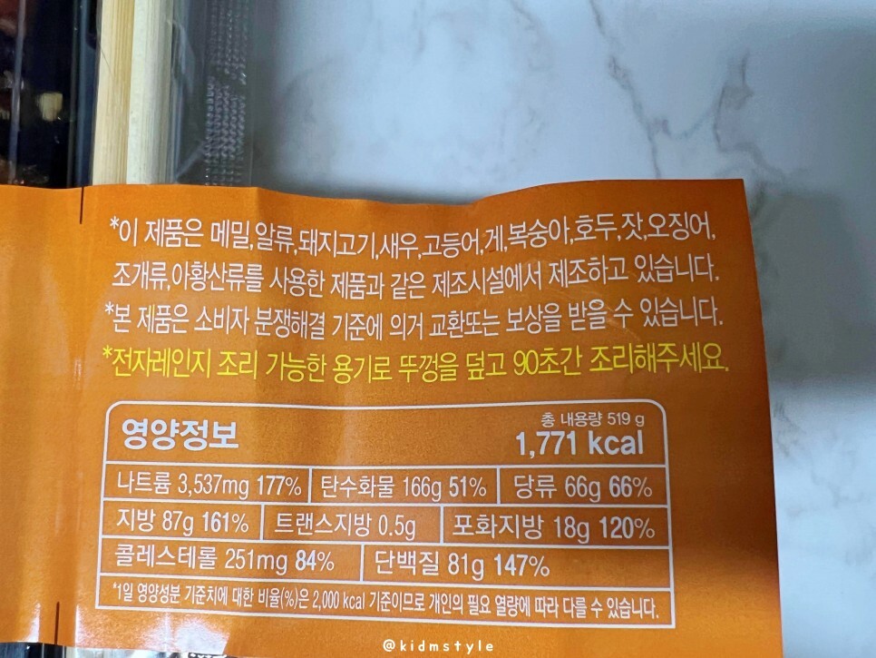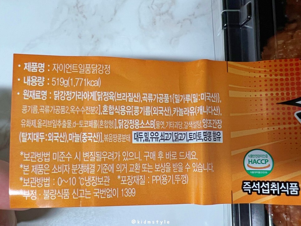 HACCP 해썹 시설에서 만든 제품이고요. 519g에 1,771kcal로 칼로리 화끈합니다. 맛있게 먹으면 0칼로리는 주문을 외우면서 맛보기로 합니다.