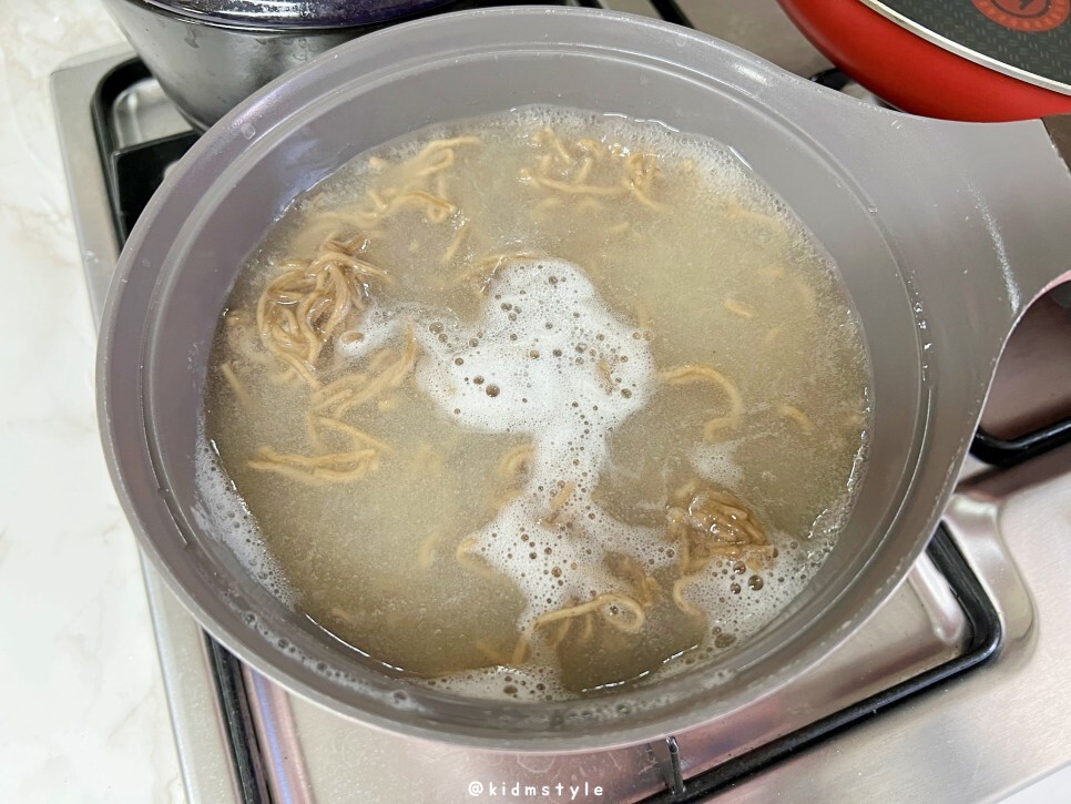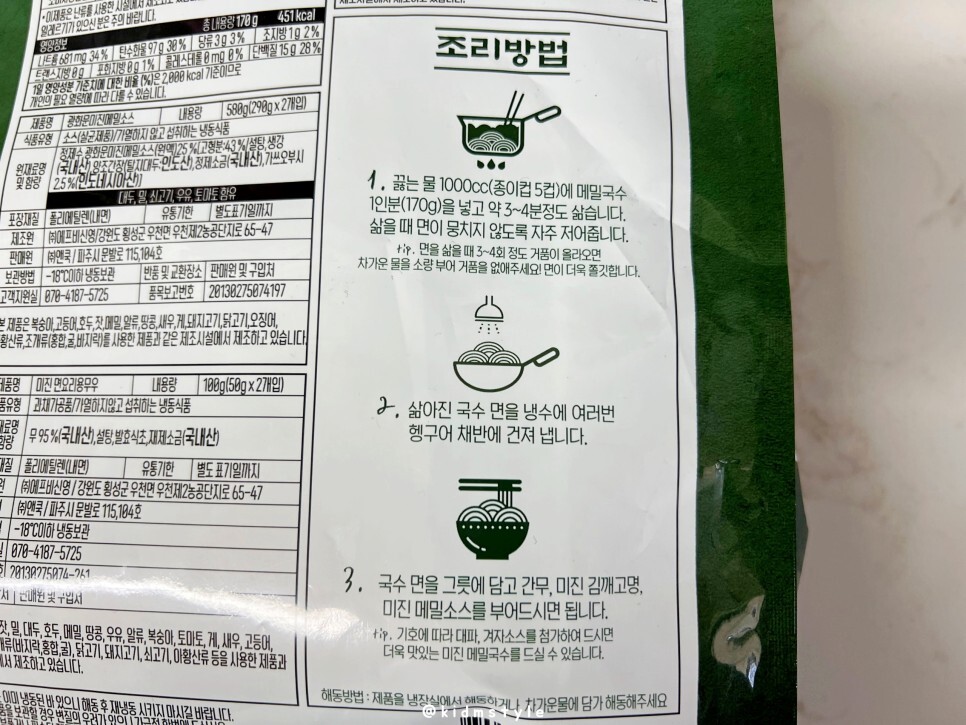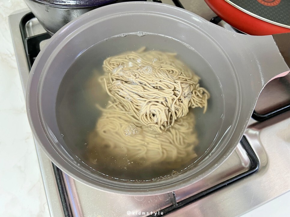 조리방법을 꼼꼼하게 읽어봅니다. 그대로 조리해야 최상의 맛을 볼 수 있죠. 면을 삶을 때 면이 뭉치지 않도록 자주 저어주고 거품이 올라오면 차가운 물을 소량 부어서 거품을 없애주기도 합니다. 그러면 면이 더 쫄깃해지니까요.