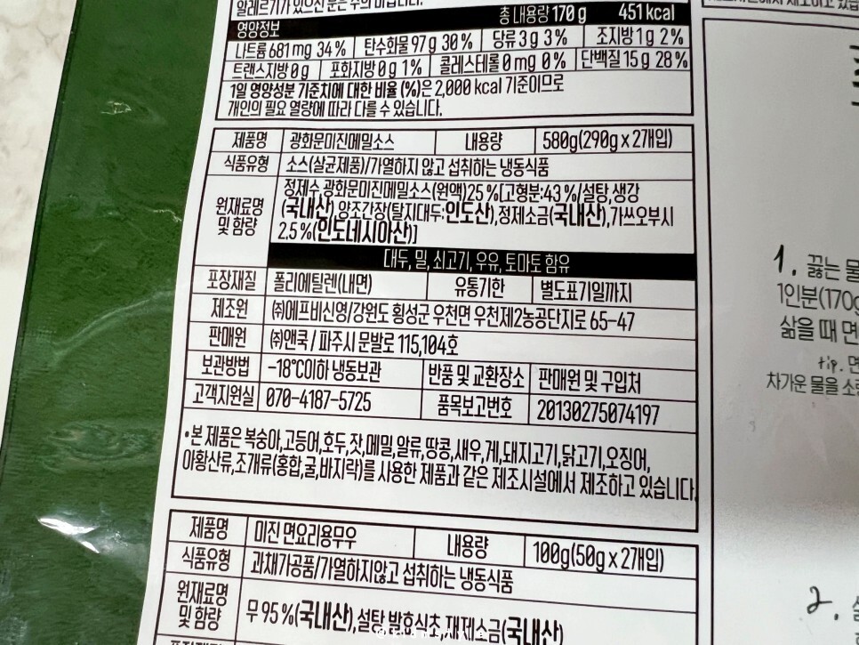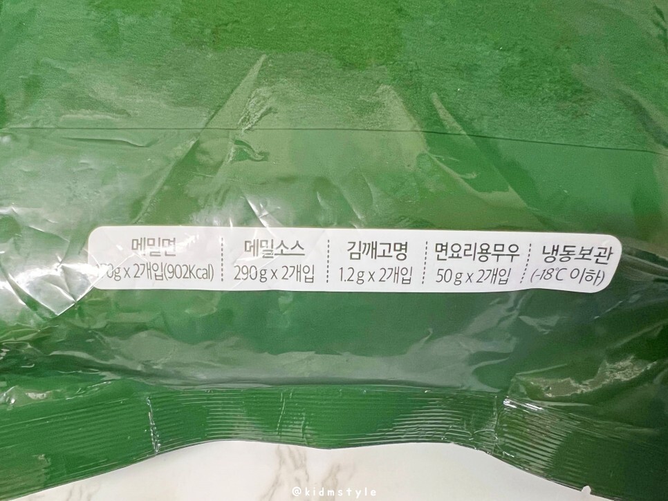 한 봉지에 2인분인데요. 메밀면 170g * 2개입 (902kcal), 메밀소스 290g * 2개입, 김깨고명 1.2g * 2개입, 면요리용 무 50g * 2개입 등의 구성입니다. 냉동보관 제품이고요.