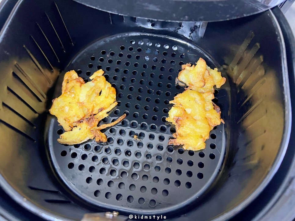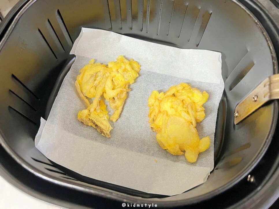 - 튀김은 180도로 예열된 에어프라이어에 앞뒤로 4분씩 총 8분을 조리합니다.