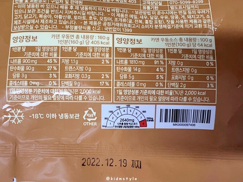 정호영 쉐프의 카덴 - 야채 튀김 우동 영양성분 정보입니다. 참고하세요. 나트륨 함량 비교표시도 아래에 있네요. 구입 시점이 작년 10월 경인데 유통기한은 상대적으로 짧은 편입니다.