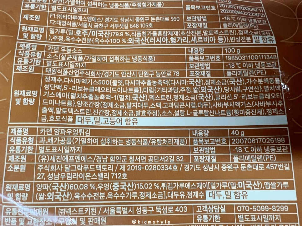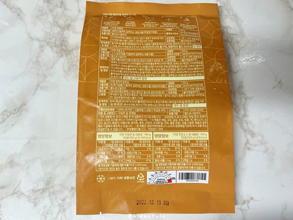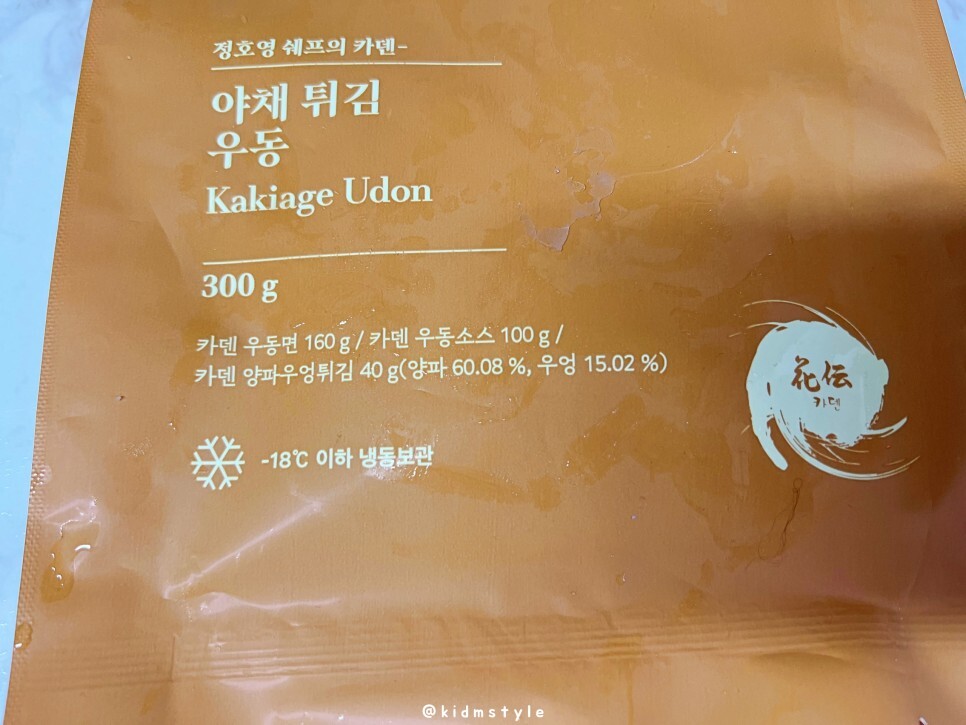 카덴 우동면 160g, 카덴 우동소스 100g, 카덴 양파우엉튀김 40g 등의 구성이며 냉동 보관을 원칙으로 합니다.