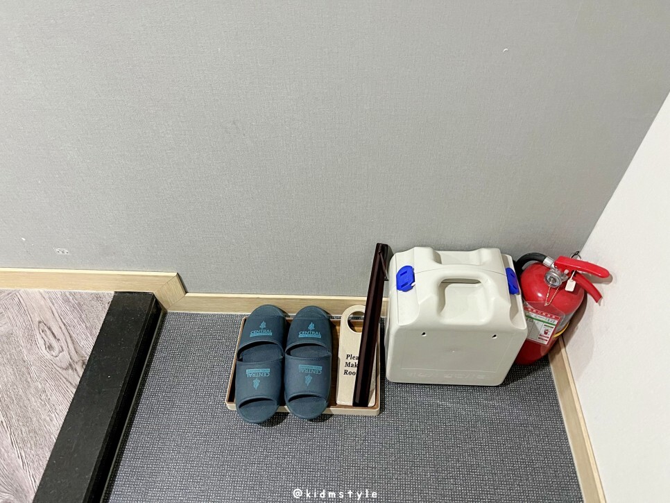 문을 열고 들어오면 바로 실내용 슬리퍼와 구둣주걱, 완강기, 소화기 등이 보이고요.