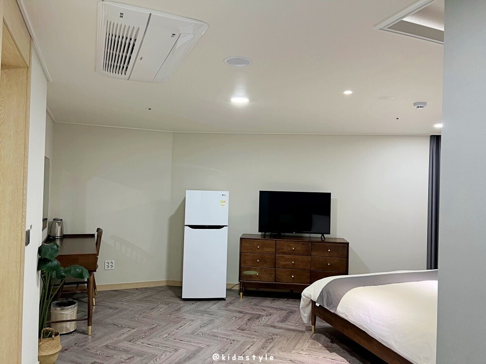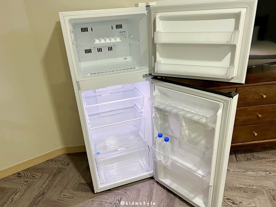 냉장고에는 500ml 생수 2병이 들어가 있으니 마시면 되겠습니다. 냉장고가 꽤 커서 마음에 듭니다. 취사는 안되지만 먹거리를 사 와서 넣어두기에 괜찮은 거 같네요.