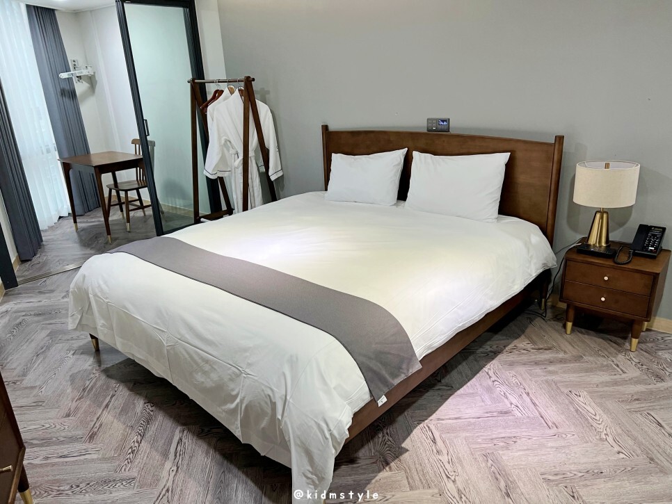 침대 사이즈는 꽤 큽니다. 침대 오른쪽으로 별도의 공간이 있는데요. 테이블 하나, 의자 하나가 놓여 있어서 간편하게 업무를 볼 수도 있습니다.