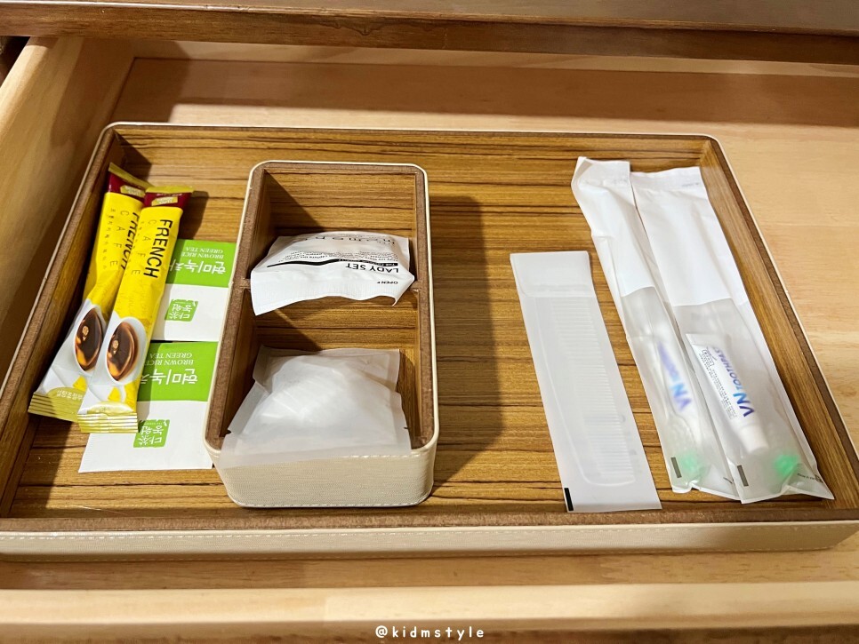 커피믹스, 녹차 티백, 일회용품들입니다. 요즘 칫솔 제공 안 해주는 숙소가 많은데요. 여기는 주네요.