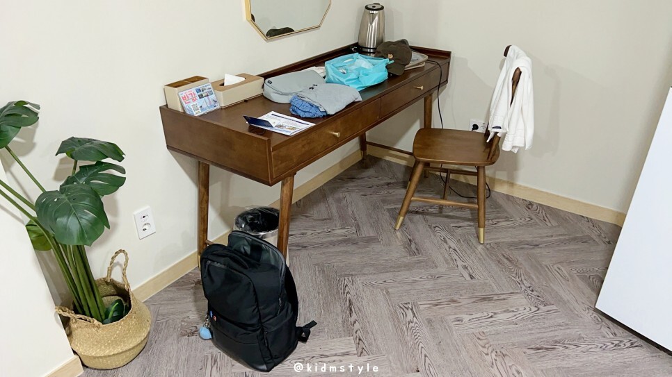 한쪽 구석에는 화장대 겸 테이블이 하나 놓여있습니다. 이쪽에는 조명이 따로 없어서 업무를 보기에는 조명을 등지고 앉는 구조라 별로네요.