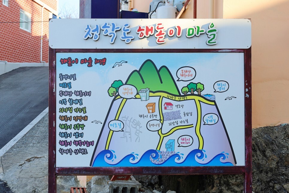 그리 크지 않은 마을이지만 10경이나 있답니다. 돌멩이길, 미로길, 봉래산 해돋이터, 이북할매길, 외가집가는길, 해돋이전망대, 해돋이공부방, 해돋이샘터, 해돋이행복나눔터, 학마루산책로 등 구경거리가 많아요.