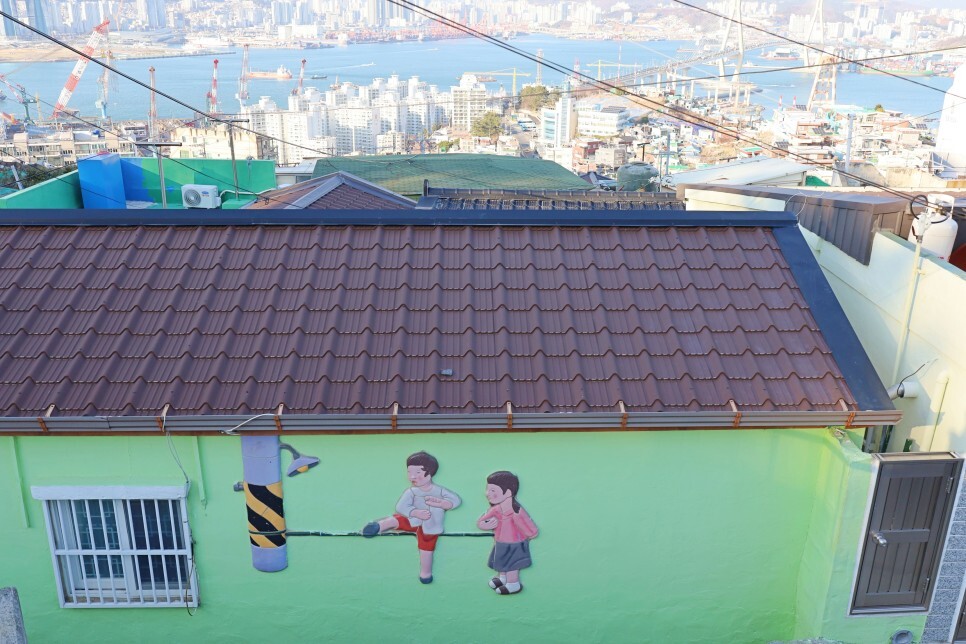 깔끔한 최신식 지붕이 인상적인 어느 집 벽면에 입체적으로 그려진 전봇대에 고무줄놀이하는 모습은 초등학생 시절 즐겁게 뛰어놀던 추억을 떠올리기에 충분합니다.