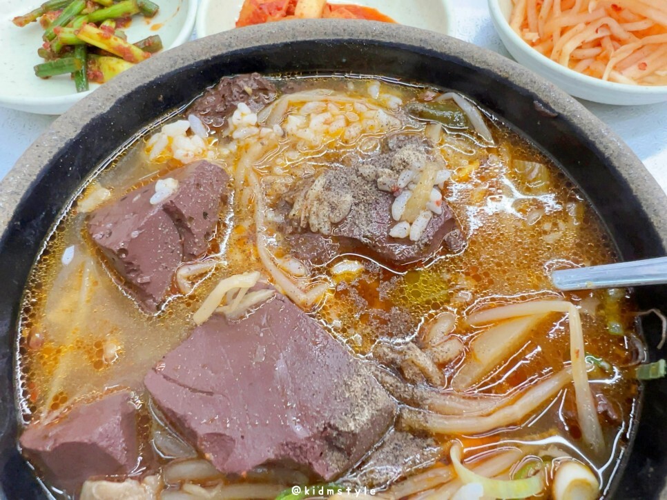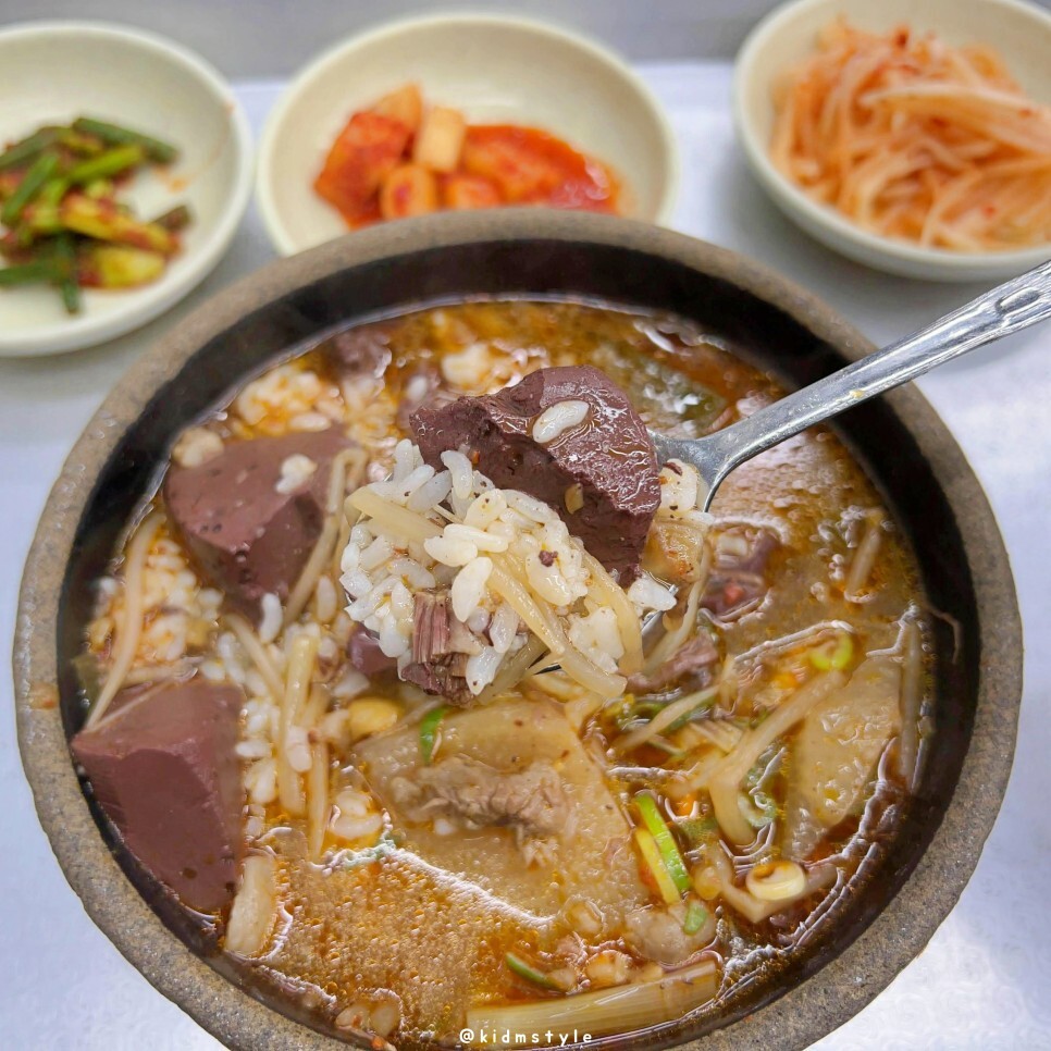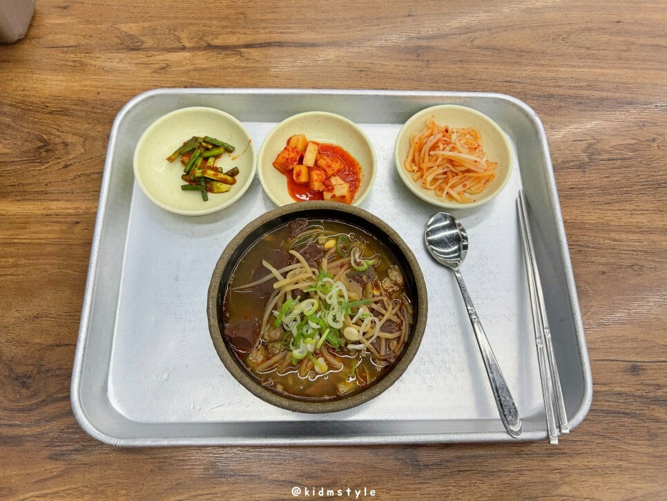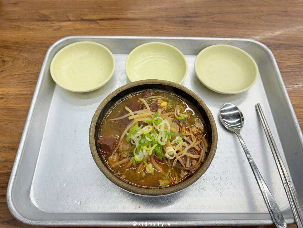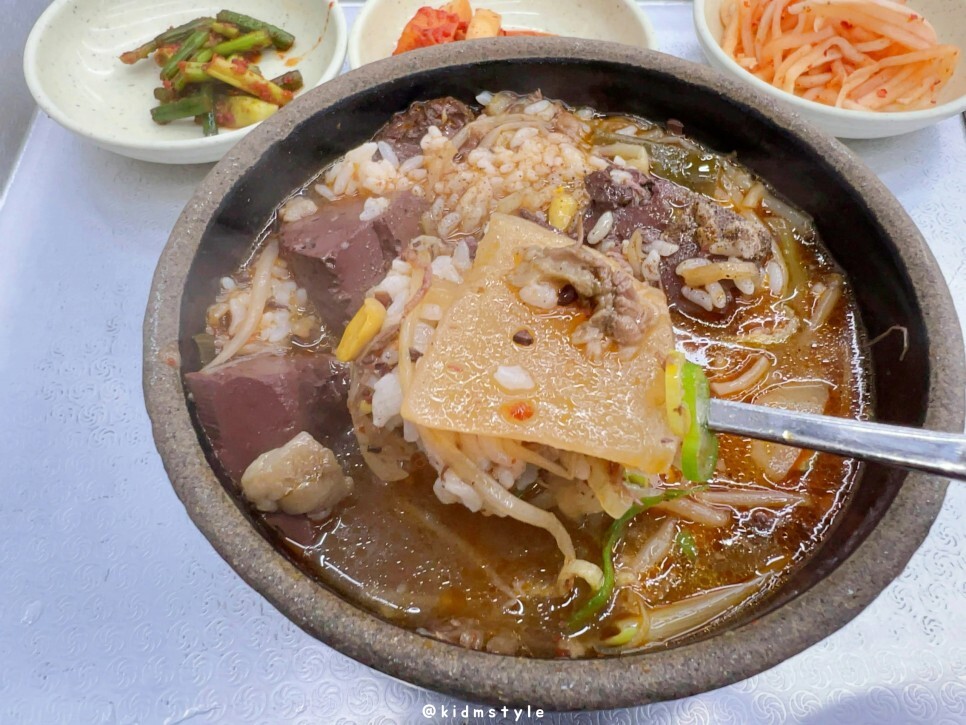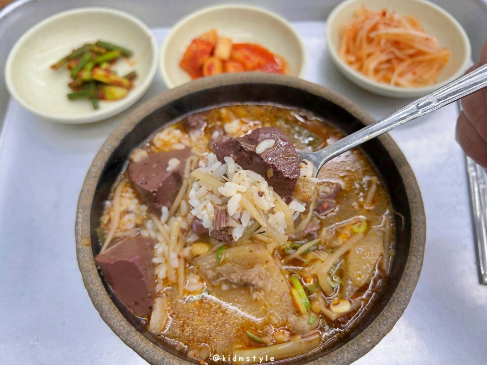 국물은 간이 좀 되어 있어요. 엄청 얼큰한 스타일은 아니고 적당히 깔끔하면서도 시원한 얼큰함을 제공해 줍니다. 아삭한 콩나물 역시 선지와 잘 어울립니다. 밥알에 국물이 잘 스며들어 있어서 기분 좋게 맛봅니다.