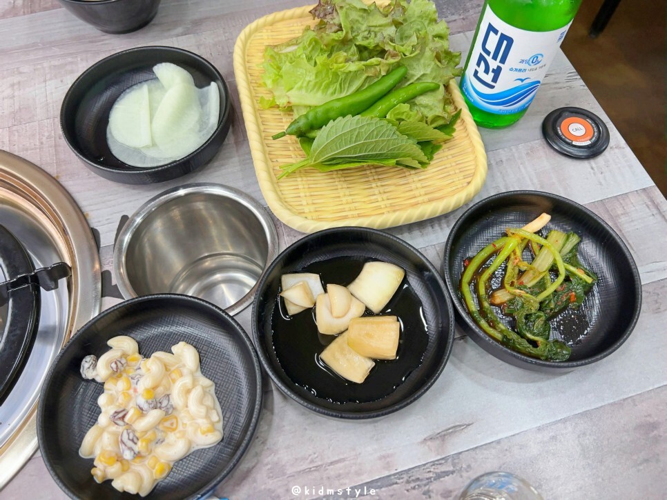 쌈무, 상추, 깻잎, 고추, 마카로니 샐러드, 양파지, 열무김치가 깔리고