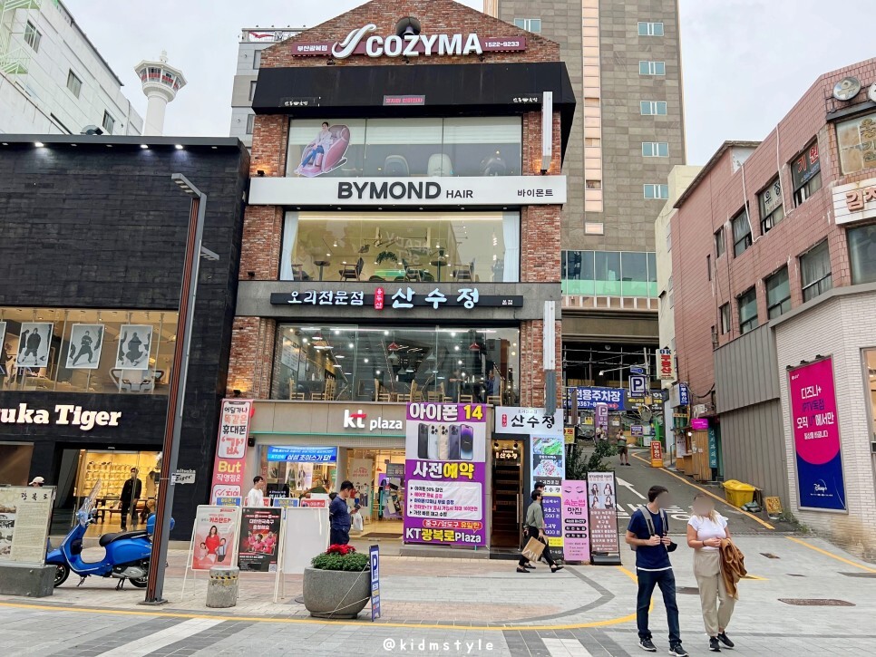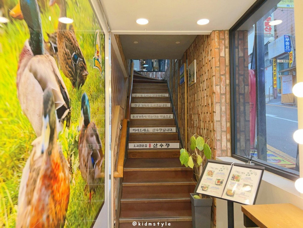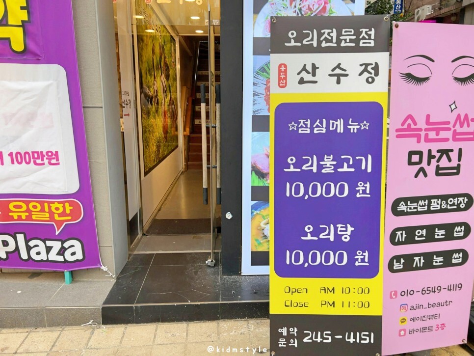 광복로 중간쯤이에요. 2층에 오리전문점 산수정이라는 간판 한 번쯤 보셨을 거예요. 이전까지 돼지국밥집이었는데 폐업하고 한동안 공실이더니 오리집이 들어왔네요. 정면에 보이는 입구가 있고 오른쪽 경사로 위에 2층으로 바로 연결되는 입구 등 2개가 있습니다.