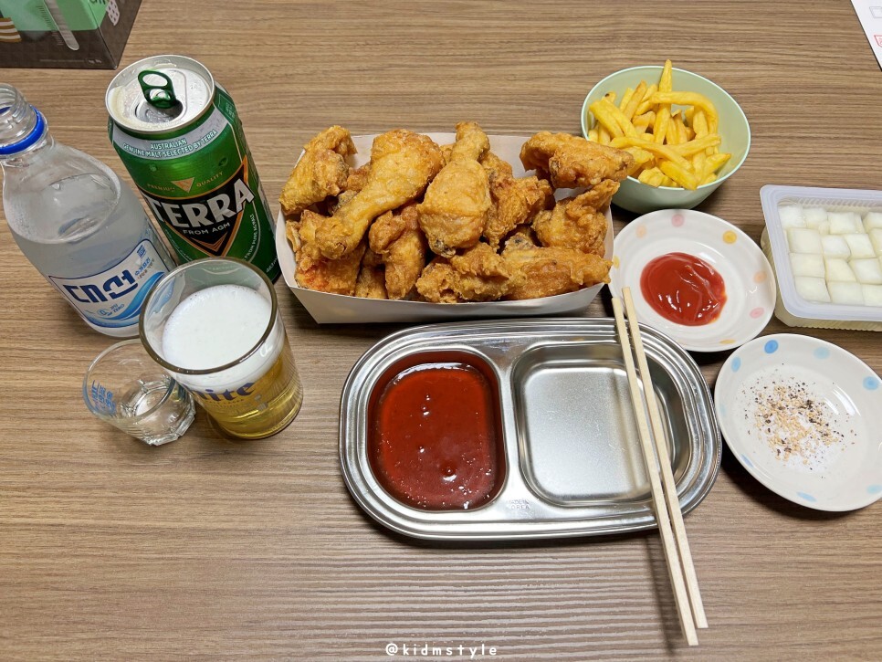 치킨에 술이 빠지면 섭섭합니다. 소맥으로 맛보기로 합니다. 대선과 테라의 조합인데요. 비록 혼술이지만 소맥 제조는 심혈을 기울여서 키드엠표 소맥으로 완성시켜봅니다.
