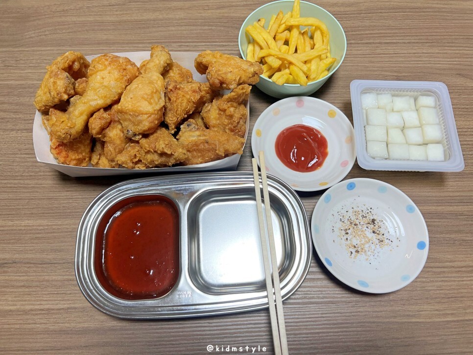 필요한 것들을 이것저것 담고 가볍게 차려보았습니다. 2칸짜리 식판이 치킨 먹을 때 정말 편합니다.