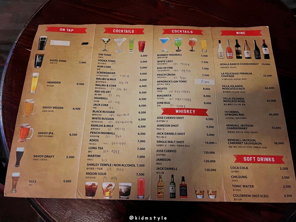 맥주, 칵테일, 위스키 등 다양한 술을 판매합니다. 지난 10월에 방문한 터라 가격 변동이 있을 수는 있겠네요.