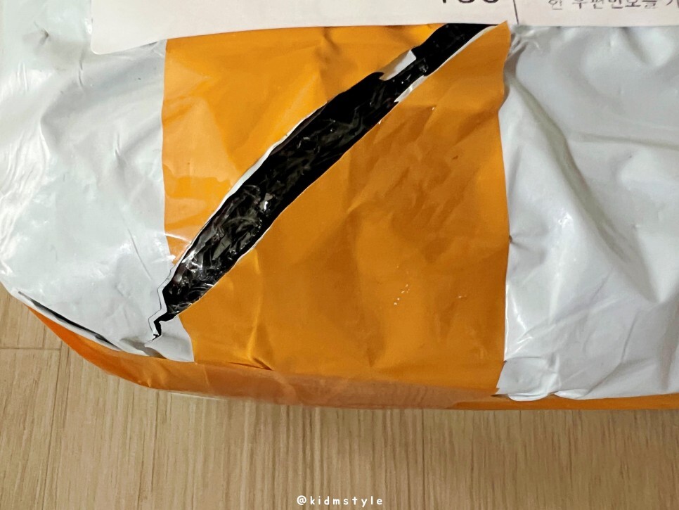 택배를 받았는데 칼로 그은 자국이 있더군요. 아마 세관 쪽에서 발생한 흔적 같습니다. 저도 해운, 항만, 물류 업계에 10년 넘게 몸을 담고 있어서 업무의 노고는 잘 알겠는데 천 재질의 제품에 이렇게 칼질을 해놓은 건 조금 아쉽더군요. 뭐 이해는 합니다.