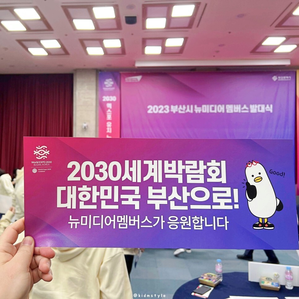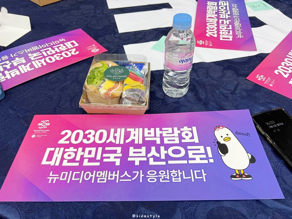 간식이 준비되어 샌드위치와 물 한 병 가지고 왔고요. '2030 세계박람회 대한민국 부산으로! 뉴미디어 멤버스가 응원합니다'라는 응원 메시지가 담아져 있는 종이 슬로건도 하나씩 받았어요. 나중에 단체 사진 찍을 때 손에 들 예정입니다. 부기도 응원하네요. 'Busan is Good!'이라고 말입니다.
