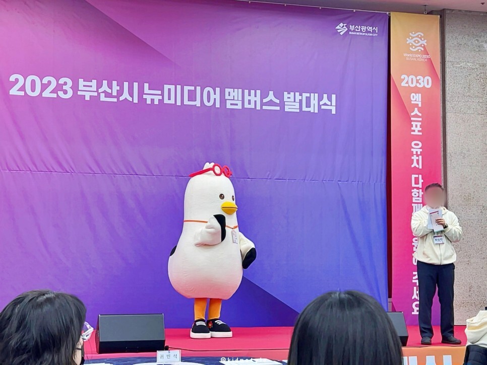 장내 정돈 멘트가 끝나고 본격적으로 행사가 시작됩니다. 본 행사에 앞선 사전 행사인데요. 부산 시민이라면 많이들 접해 본 부기가 등장했습니다. 부기는 부산시 sns 소통 캐릭터로 '부산 갈매기'의 줄임말이에요.
