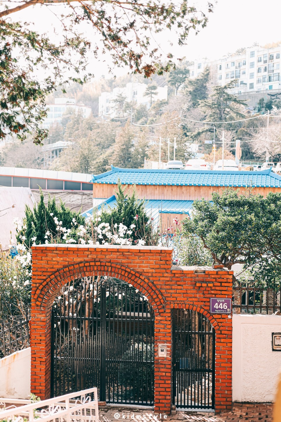 목련이 예쁘게 핀 빨간 벽돌 대문 집을 지나서 쭉 걸어올라가요.