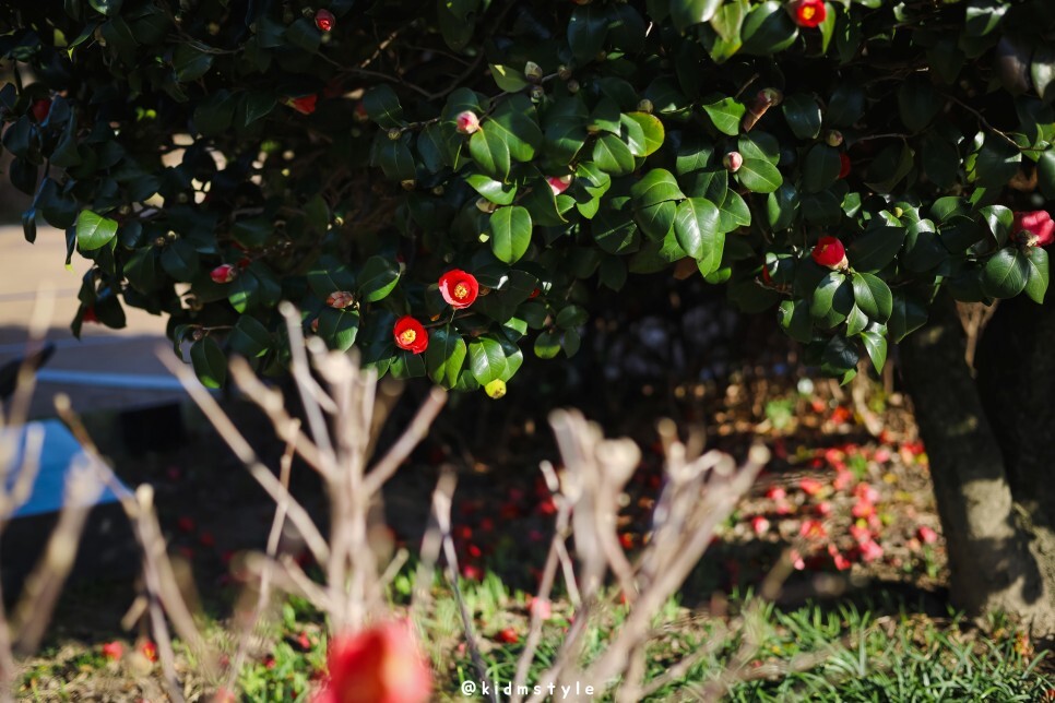 그리고 길을 따라 민주공원으로 가다 보면 동백나무들이 눈에 들어오는데요. 다양한 색깔별로 피어있는 동백꽃을 만날 수 있답니다. 하얀색 동백꽃 보셨나요?